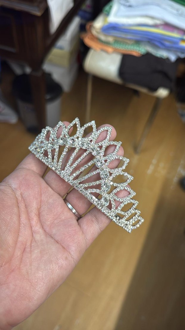 Beyaz payetlerle süslenmiş, klasik tasarımlı çocuk prenses tacı, zarif bir ışıltı katıyor.