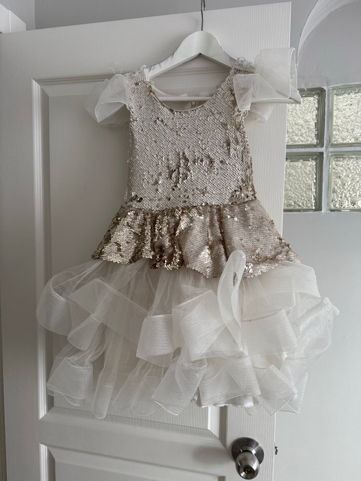 Kolsuz, payet işlemeli ve kat kat fırfırlı etekli, bohem tarzda kız çocuk elbisesi. Vücuda oturan kesimi ve sentetik kumaşı ile şık bir modeldir.
