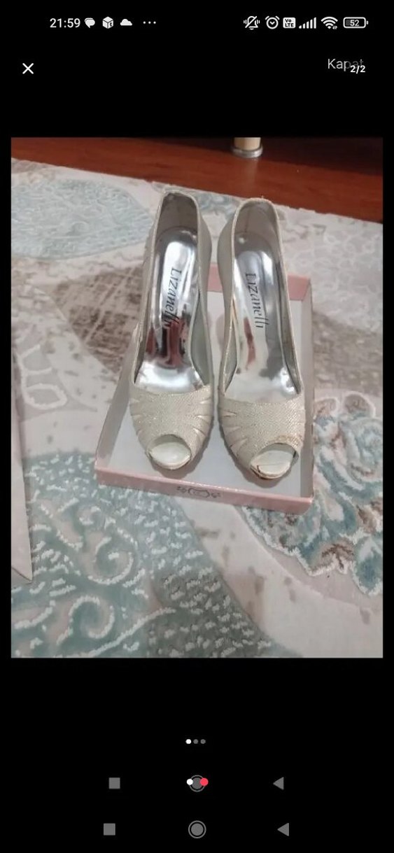 Beyaz payetli ve desenli, yüksek topuklu abiye ayakkabılar. Düğün ve özel günler için modern klasik tarzda, göz alıcı bir şıklık sunar. bir kere düğünde giyindim.marka temsili
