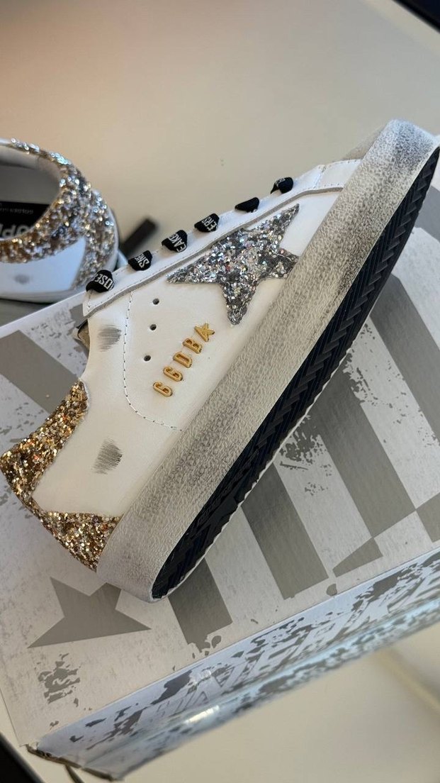 Beyaz kadın spor ayakkabısı, platform topuklu, parlak payet detayları ve baskılı desenlerle süslenmiş. Kauçuk tabanlı, sportif ve şık günlük kullanım için uygundur. ✨