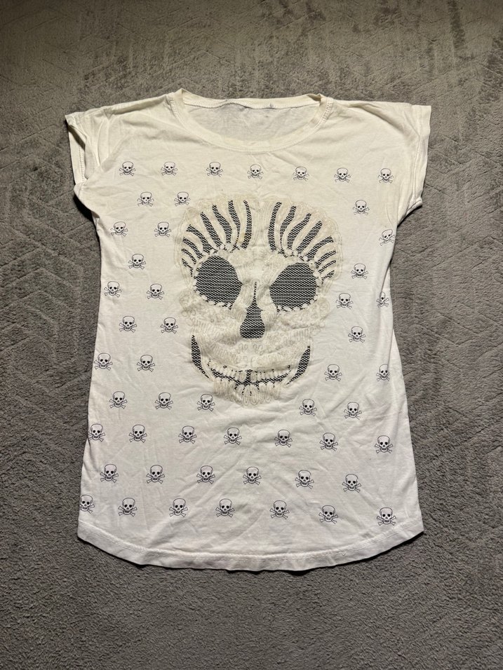 Beyaz renkli, pamuklu, kısa kollu tişörtü. Salaş kesim ve yuvarlak yaka, payetli kafatası baskısıyla rock punk tarzı yansıtıyor.