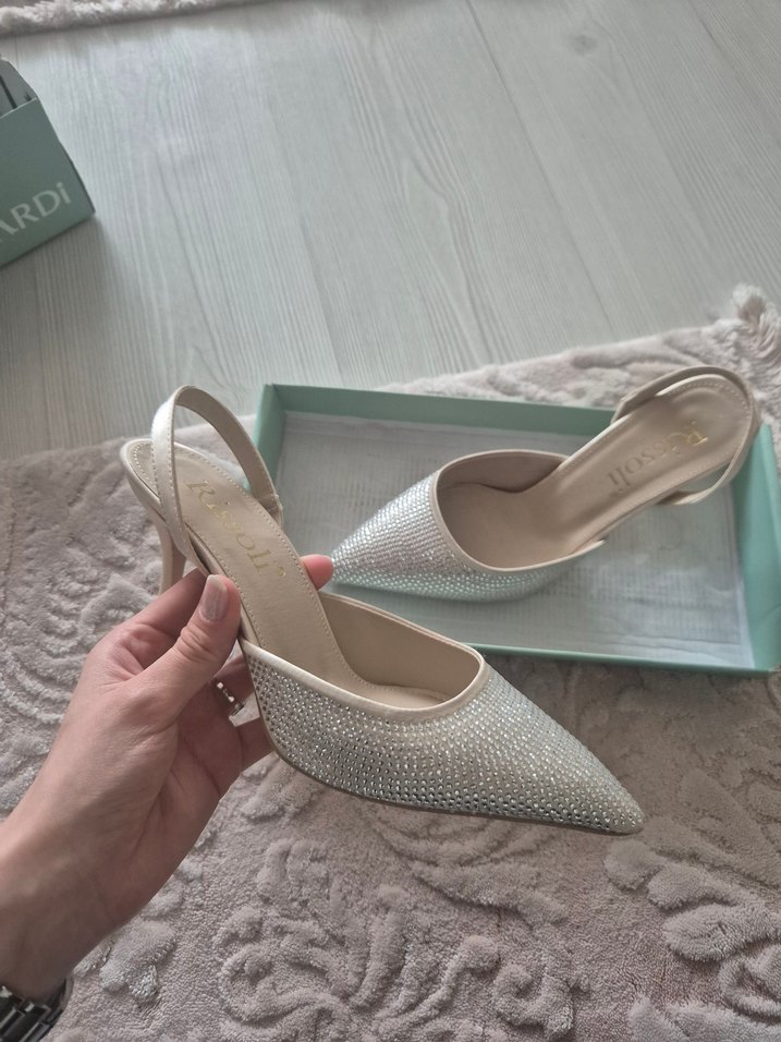 Beyaz renkli, payetli ve yılan desenli stiletto topuklu, lastik tabanlı ve arka bantlı şık düğün ayakkabısı.