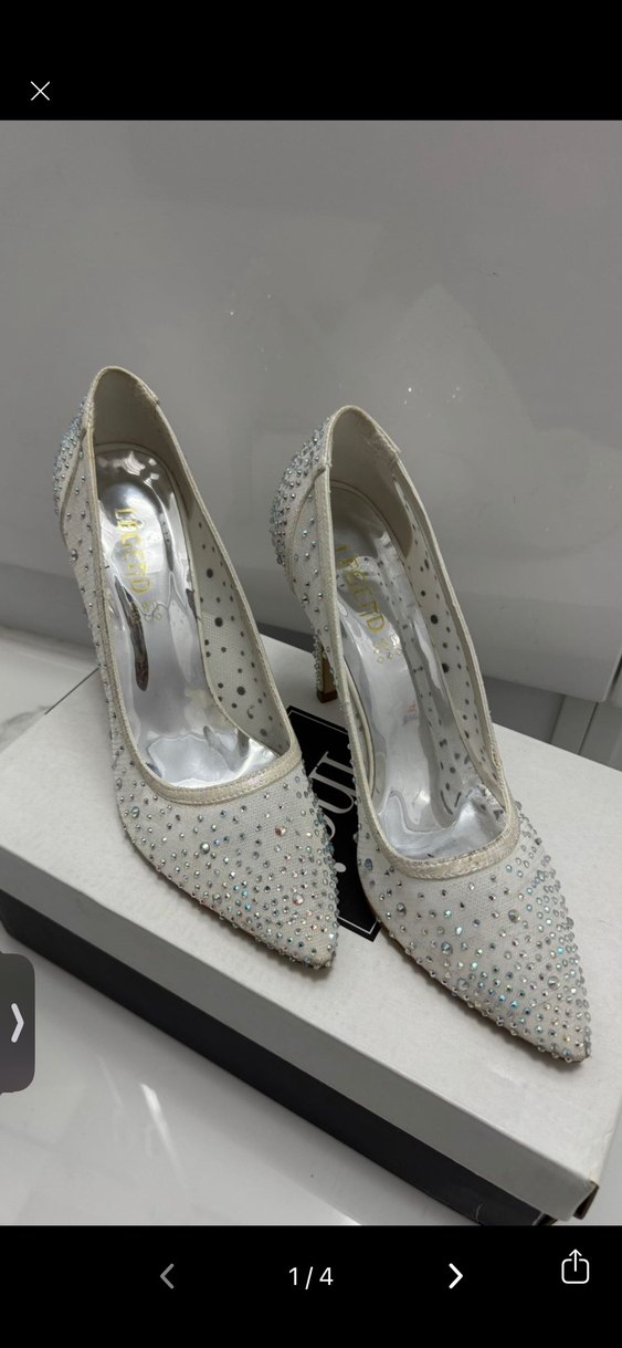 Beyaz topuklu ayakkabılar payetlerle süslenmiş ve ince yılan deseni taşır. Klasik ve çağdaş şıklığı bir araya getirir. Kauçuk tabanlıdır. Nikahımda kullandım