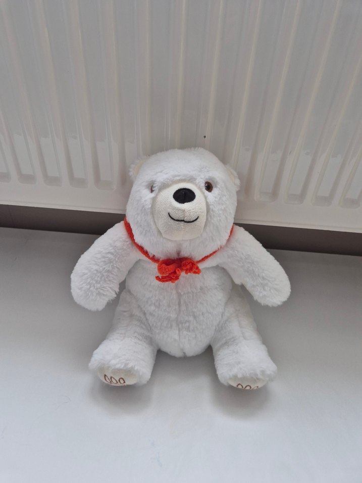 Yumuşak dokulu beyaz peluş ayı, boynunda renkli kırmızı atkı ile. Her yaşa uygun kucaklanabilir oyuncak. Hediye geldi ama kullanılmadı.