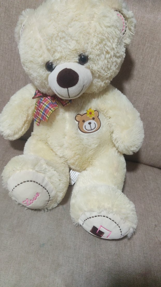 Yumuşak beyaz peluş ayı oyuncak, renkli kareli fiyonk ve göğsünde sevimli ayı işlemeli. Ayaklarda nakış detayları bulunur. teklif gönderin
