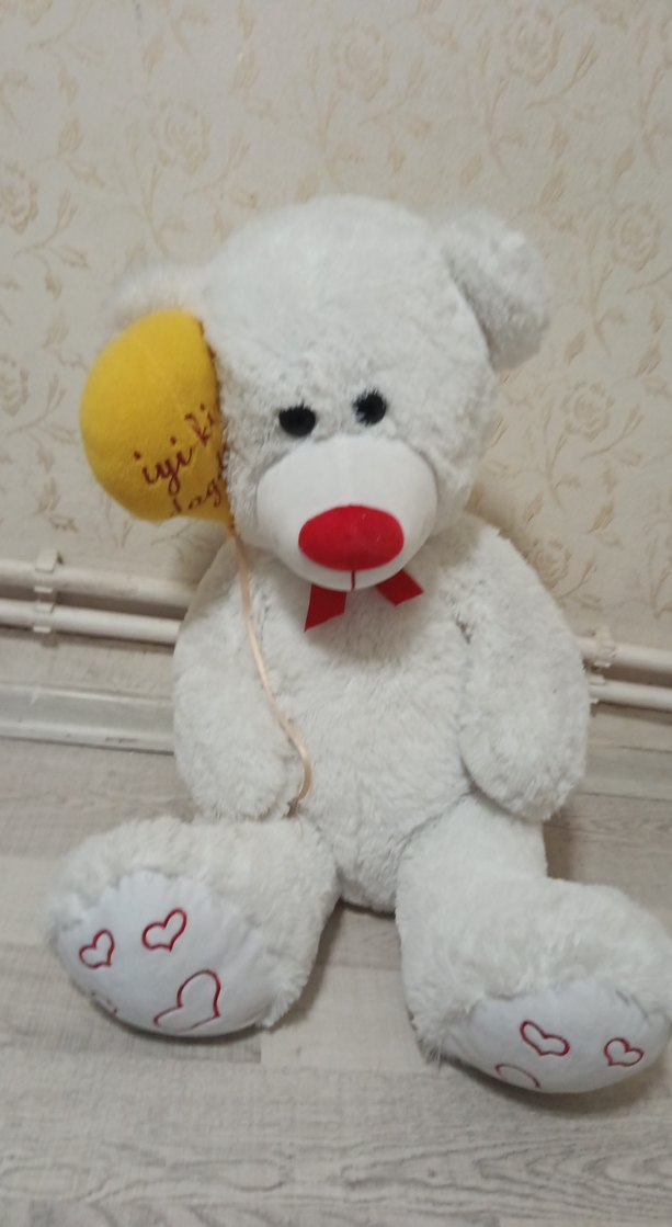 Yumuşak beyaz peluş ayı oyuncak, sarı balon ve ayaklarında kalp nakışları bulunur. Kırmızı burun ve fiyonk detaylıdır.