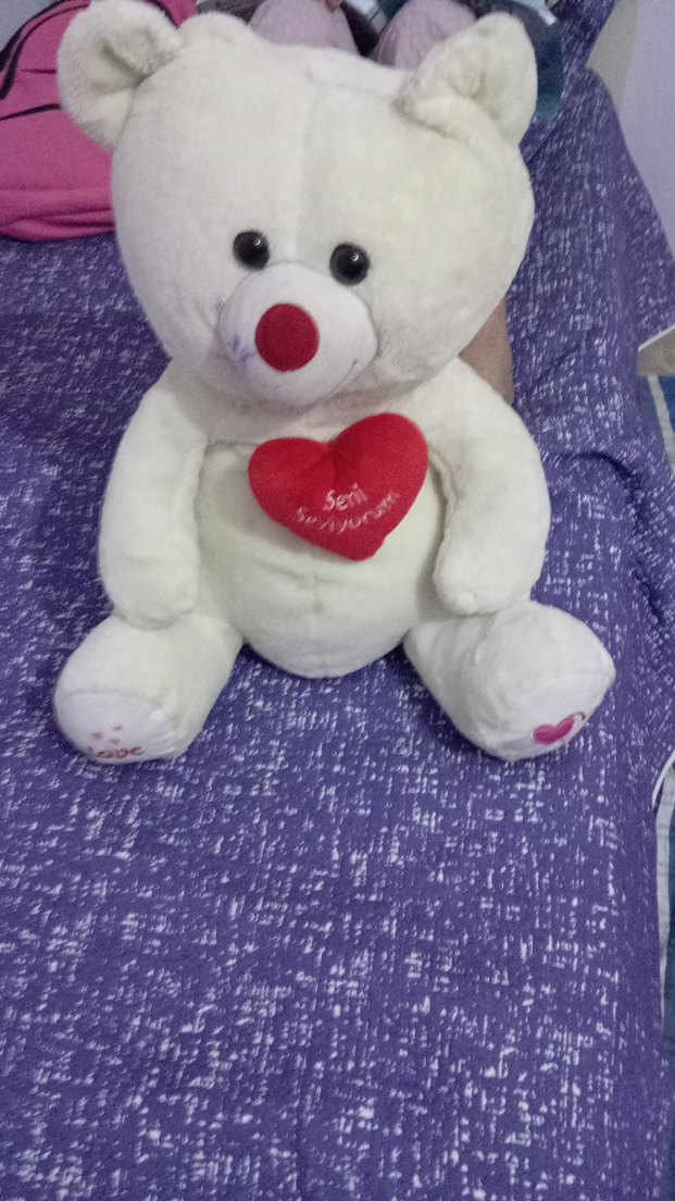 Beyaz renkli, yumuşak peluş ayıcık kırmızı kalp tutuyor ve üzerinde 'Serin' yazıyor. Hafif renk tonunda ve sarılmaya uygun.