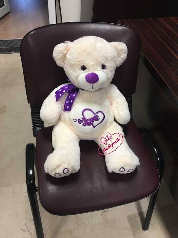 Yumuşak beyaz peluş ayıcık, mor burun ve fiyonk detaylı, gövdesinde kalp ve 'Love' nakışı bulunur.