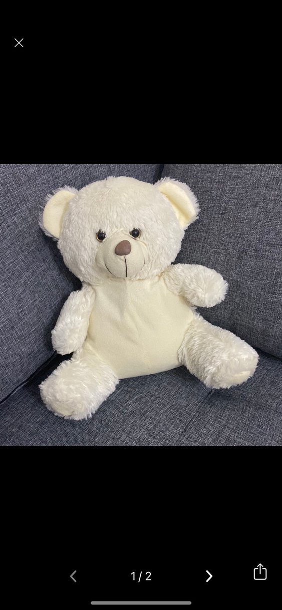 Yumuşak beyaz peluş ayıcık. Kulak arkası duvar boyası olmuş. Fotoğraflara ekledim.