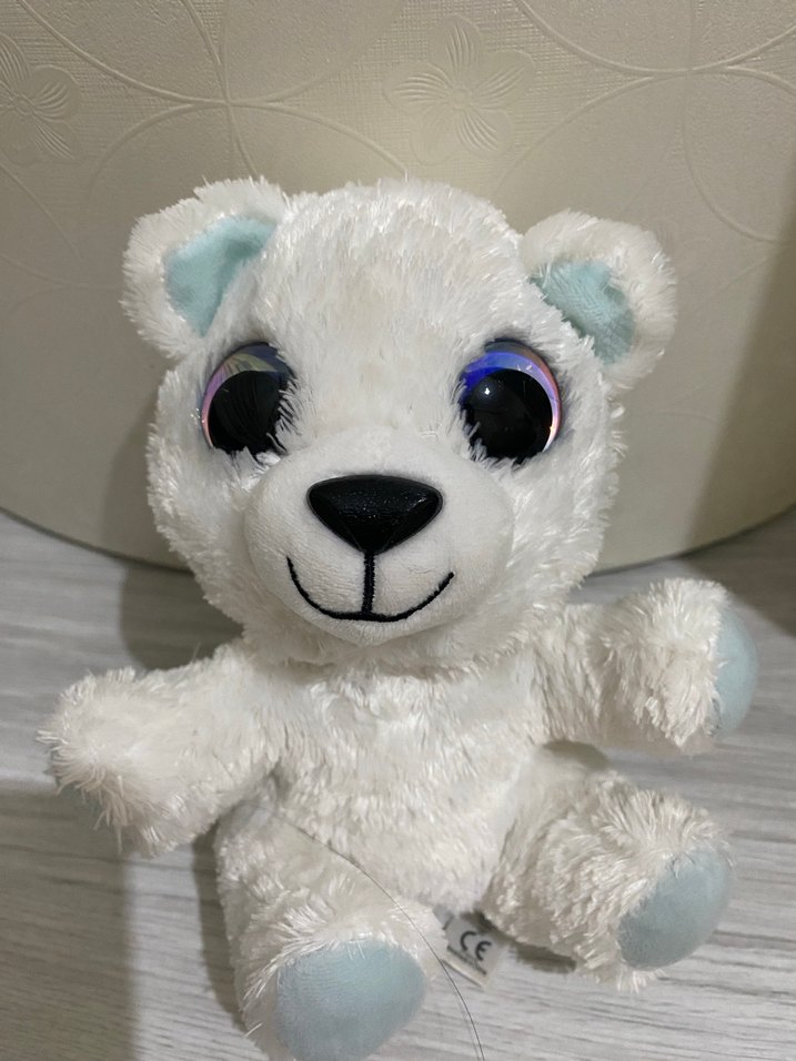 Büyük renkli gözlere ve kulaklarla patilerde açık mavi detaylara sahip yumuşak beyaz peluş ayıcık oyuncak.