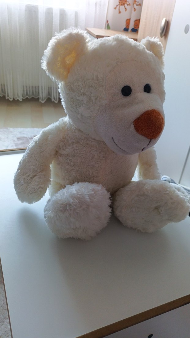 Siyah gözlü ve kahverengi burunlu, yumuşak ve açık renk beyaz peluş ayıcık oyuncak.