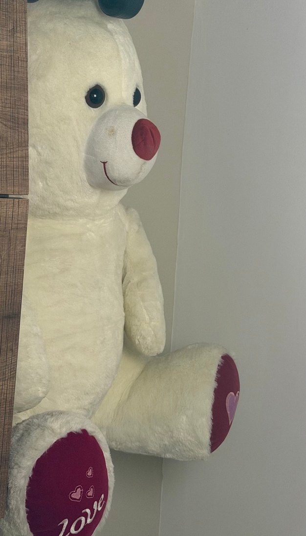 Yumuşak beyaz peluş ayıcık, hafif tonlarda ve burun ile ayaklarda pembe detaylarla. Sarılmalık bir oyuncak.