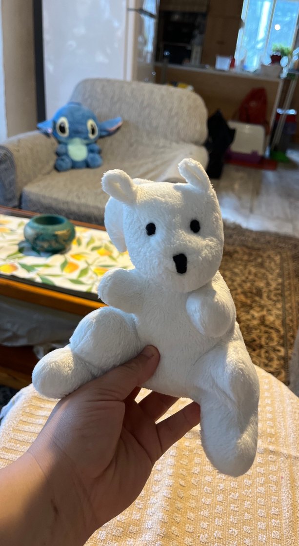 Yumuşak ve açık beyaz renkte, siyah göz ve burun detaylı peluş ayıcık oyuncak.