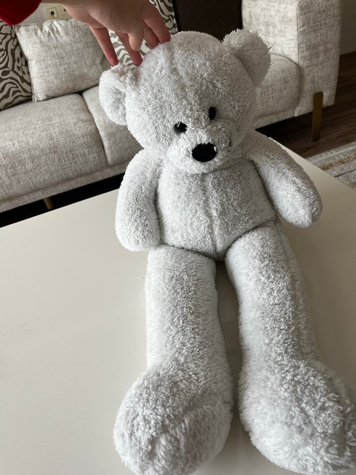 Yumuşak beyaz peluş ayıcık, gri tonlarda ve detaylı yüz ifadeleriyle rahatlatıcı ve dekoratif bir oyuncak.