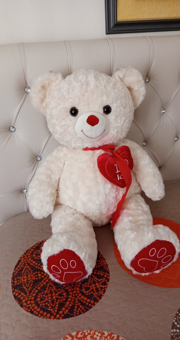 Yumuşak beyaz peluş ayıcık, kırmızı burun, patiler ve kalp şeklinde aksesuar detaylarıyla renkli. Sevimli ve sarılmalık oyuncak.