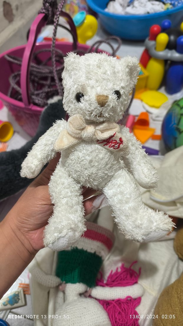 Bej fiyonk ve nakış detaylı yumuşak beyaz peluş ayıcık oyuncak .