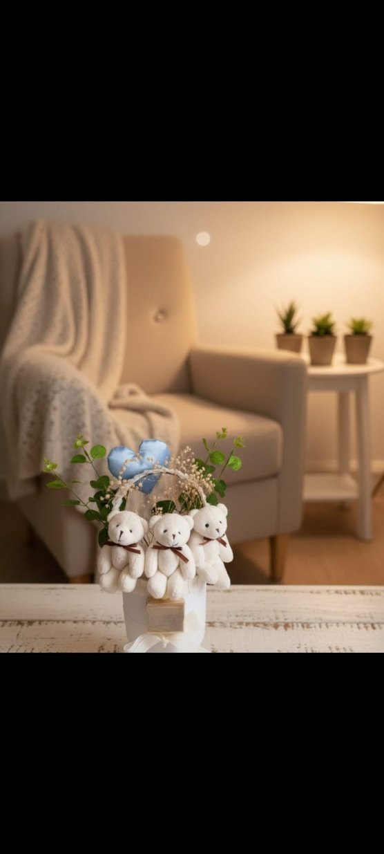 Yumuşak beyaz peluş ayıcıklar, kurdelelerle bağlanmış, yeşillik ve mavi kalpli yastıkla süslenmiş dekor. Renk ve adeti belirtebilirsiniz.