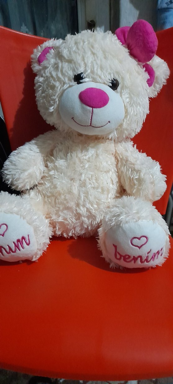 Yumuşak beyaz peluş ayıcık, renkli detaylar ve pati kısmında nakışlı yazılar bulunur. Sarılmalık ve sevimli oyuncak.