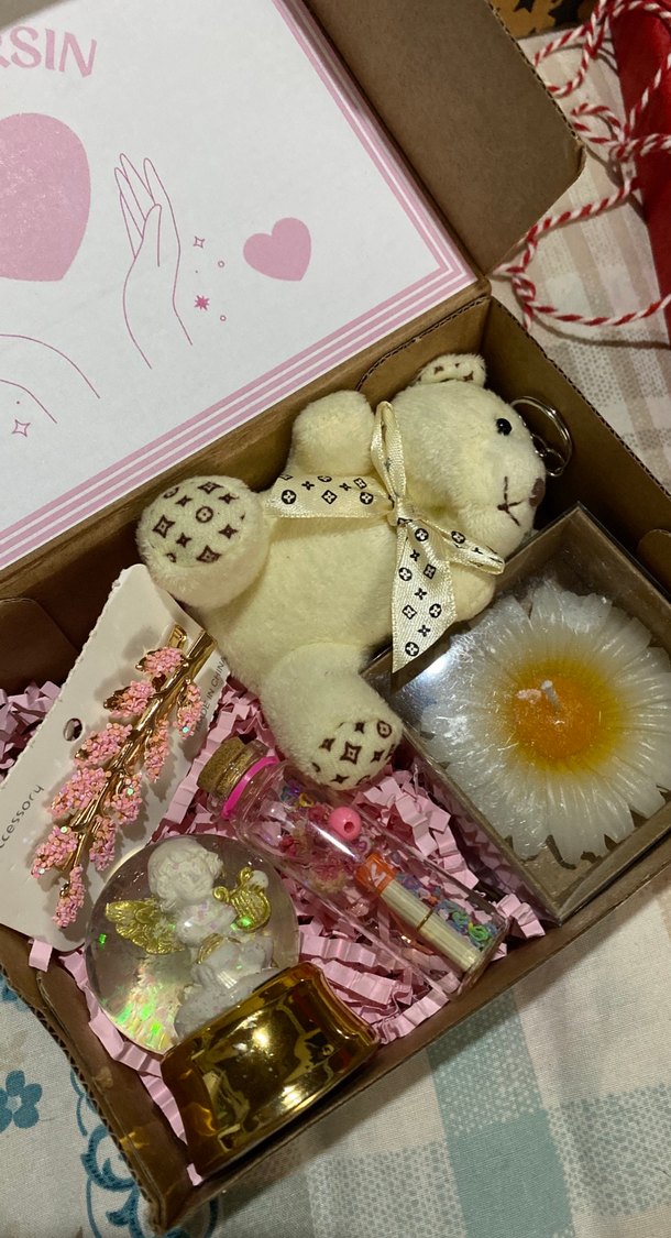 Desenli fiyonklu beyaz peluş ayıcık, dekoratif çiçek ve küçük aksesuarlar içeren hediye seti.