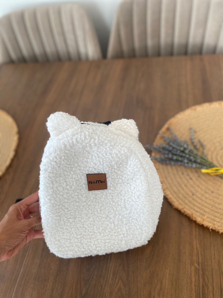 Küçük ayıcık kulaklı, yumuşak beyaz peluş bebek çantası. Deri marka etiketi bulunur. Bebek eşyalarını taşımak için uygun.