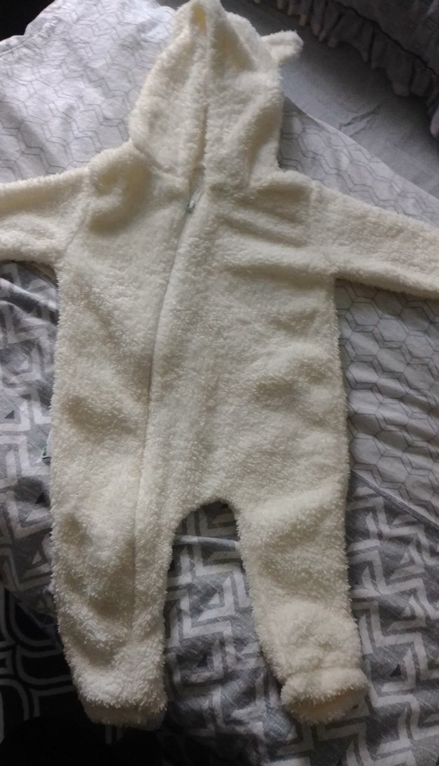 Beyaz renkte, kapüşonlu ve fermuarlı, yumuşak ve sıcak kumaştan yapılmış peluş bebek kar tulumu.