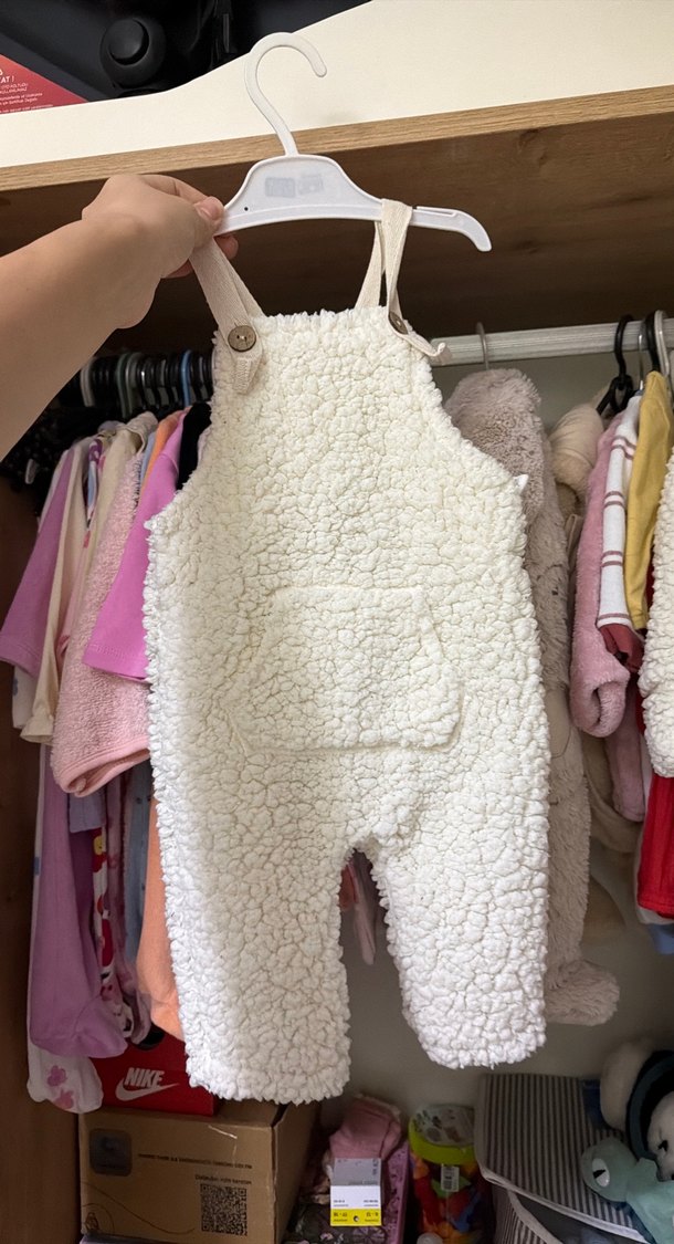 Peluş dokulu, beyaz bebek kış tulumu, yuvarlak yaka tasarımlı, minikler için sıcak tutar. Birkaç kez giyildi
