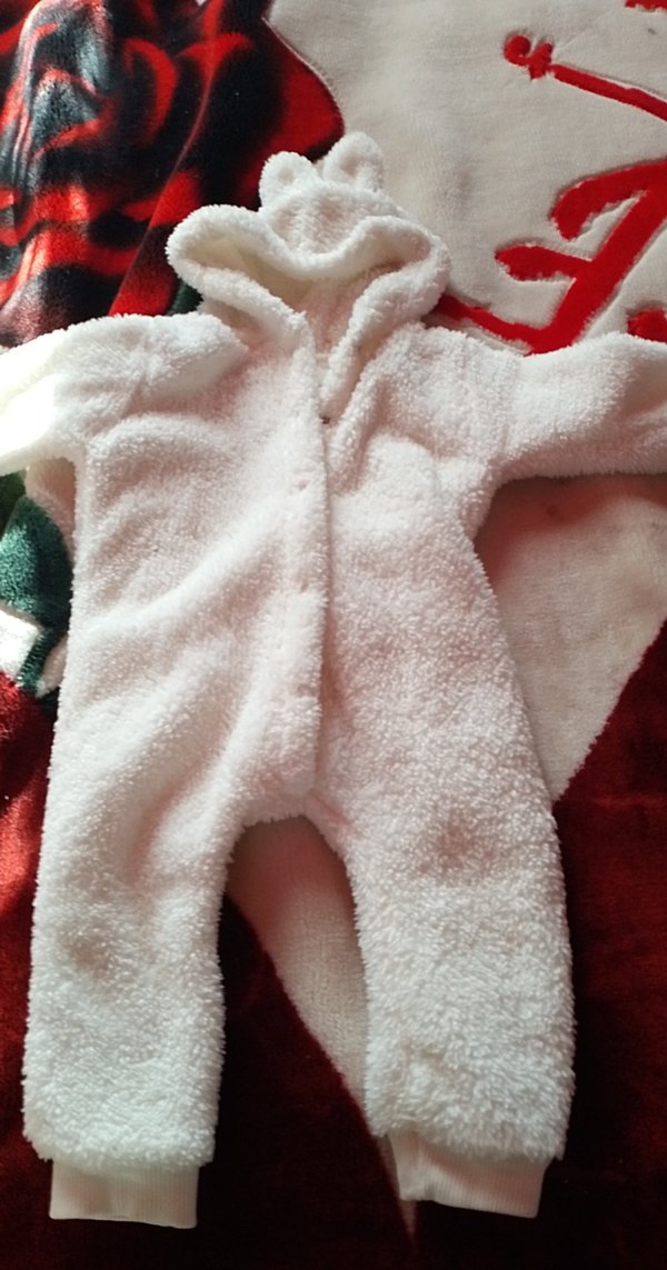 Kapüşonlu ve kesik yakalı, beyaz, yumuşak peluş kumaştan yapılmış bebek kız tulumu, sıcaklık ve rahatlık sağlar. ❄️