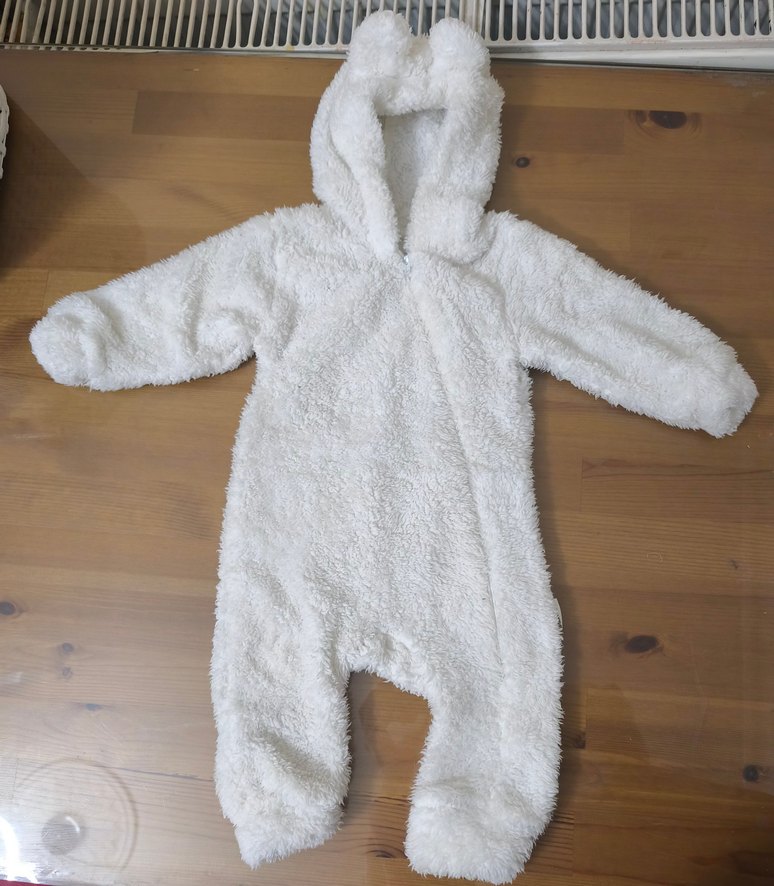 Yumuşak ve sıcak kumaştan, kulaklı kapüşonlu beyaz bebek tulumu, soğuk havalar için rahatlık sağlar. ❄️ 9 ay. 1-2 defa kullandı
