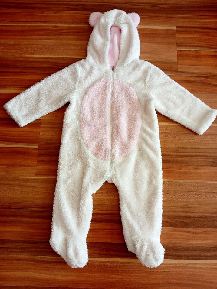Pastel beyaz renkli, yumuşak peluş detaylı, kulaklı kapüşonlu bebek tulumu. Önden fermuarlı ve ayaklıdır.
