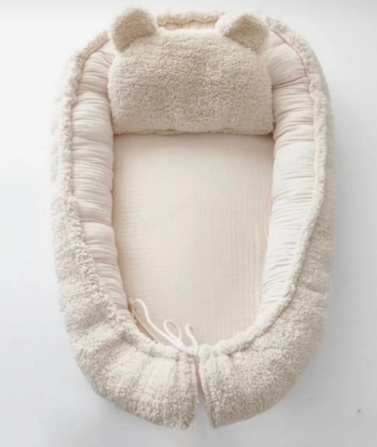 Pastel beyaz renkte, yumuşak ve sıcak dokulu bebek uyku yatağı, sevimli ayıcık kulaklı yastık ile.