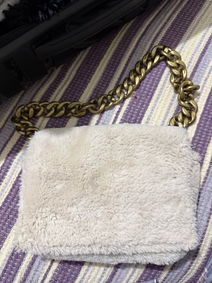 Peluş beyaz çanta, kürk detaylı ve kalın zincir askılı, rahat bohem tarzıyla günlük kullanıma uygun.