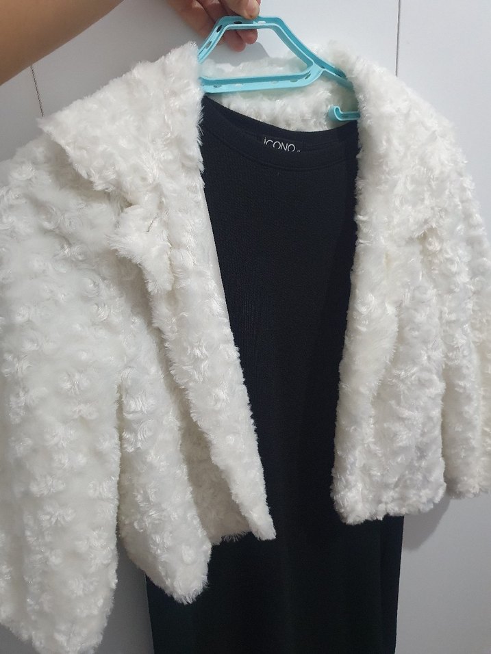 günlük ve gece elbiselerinin üstüne beyaz, peluş ve kürk detaylı, yarım kollu, yakası kesik ceket. Bohem ve retro stiline uygundur. sadece 1 kez giydim 1000 tl ye aldım