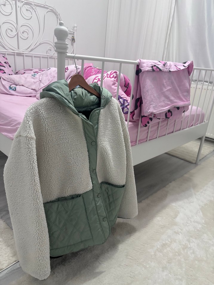 Çok az giydim tarzıma uymuyor markasını bilmiyorum Yüksek yakalı, uzun kollu ve bol kesim beyaz kadın ceket. Yumuşak peluş ve kapitone kumaş detaylarıyla rahat ve sokak tarzı bir görünüm sunar.