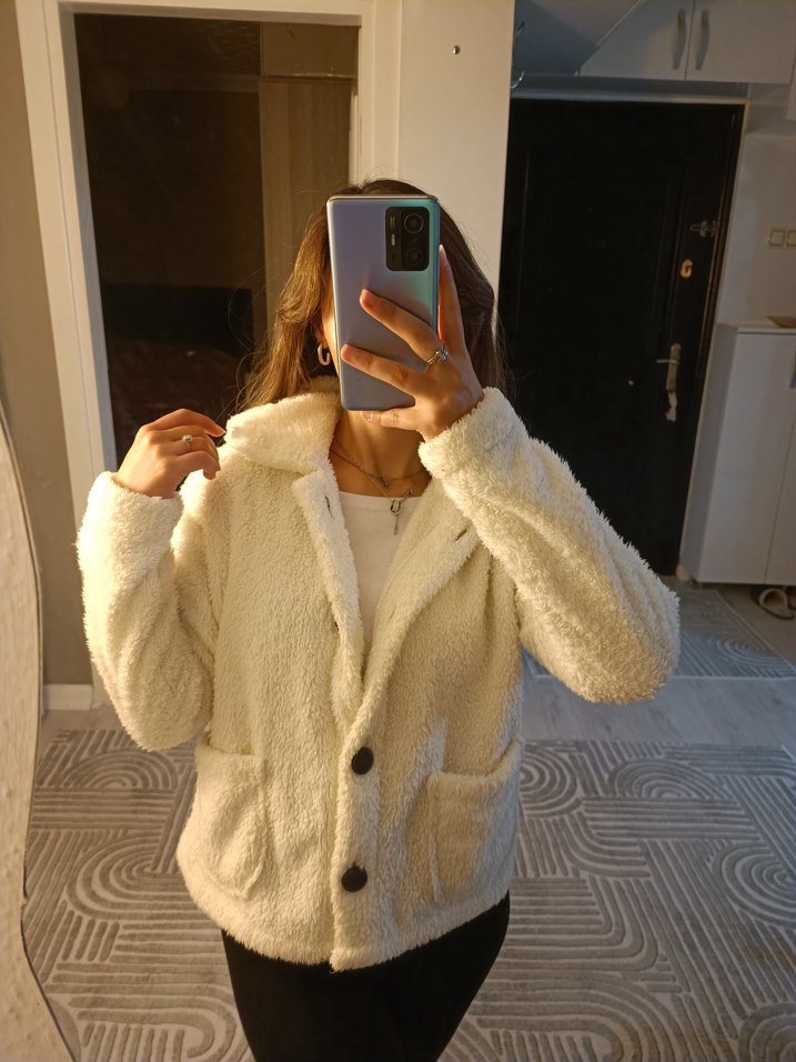 Beyaz renkte, peluş detaylı ve uzun kollu kadın kışlık ceket. Rahat kesimi ve cepleriyle günlük sokak stili için uygundur. ❄️