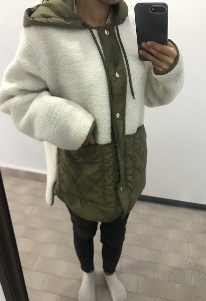 Beyaz renkte, peluş dokulu ve bol kesim kışlık kaban. Uzun kollu, yakası notched lapel ve kapüşonu ile rahat ve sıcak tutar. Günlük kullanıma uygun. ❄️ max 3 kere giyildi