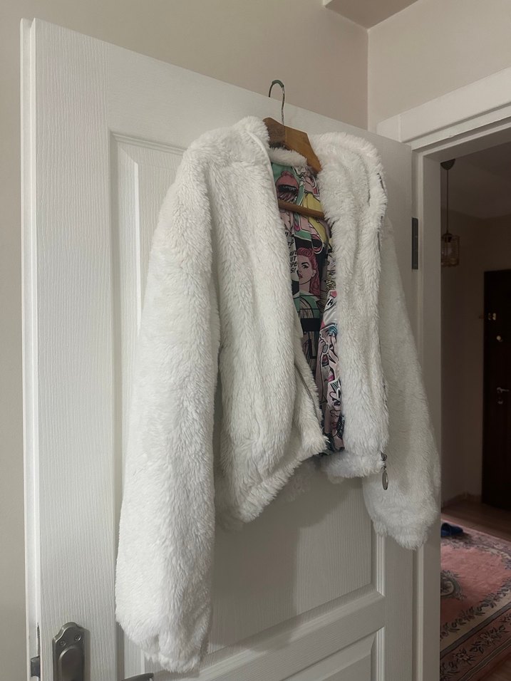 Uzun kollu, beyaz peluş detaylı, bol kesim midi kadın ceket. Yaka kısmı kesik ve iç kısmı renkli tie-dye desenli. Günlük kullanıma uygun rahat bir parça.