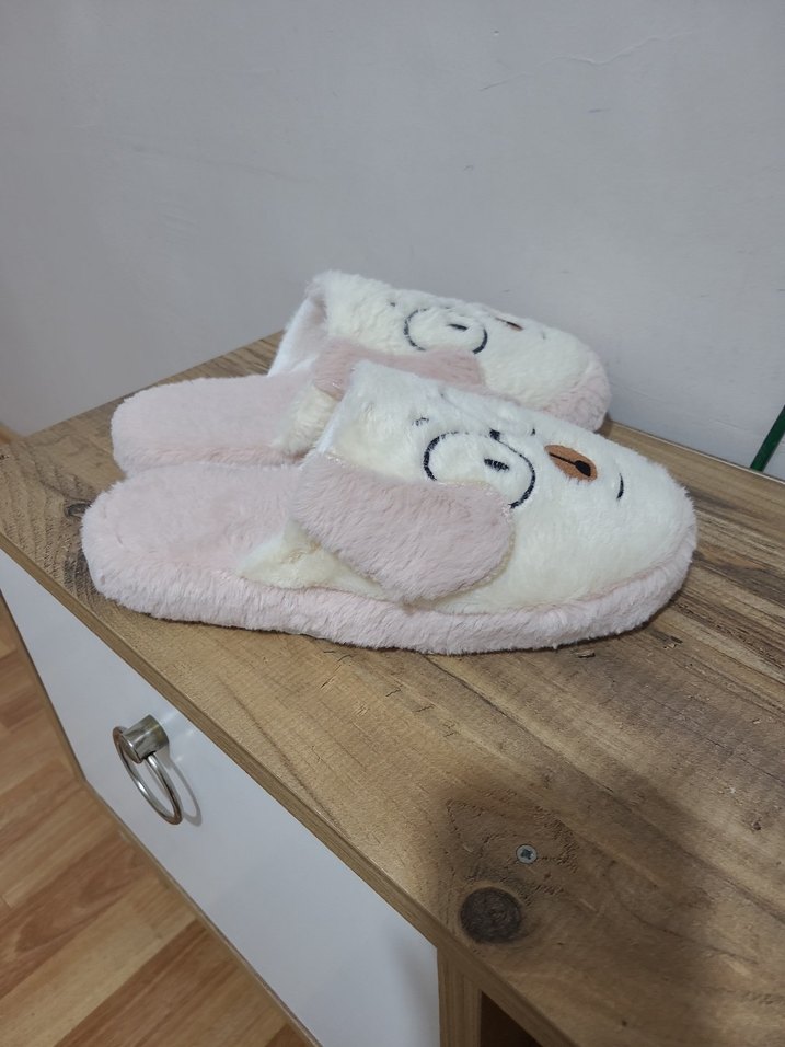 Beyaz peluş, kürklü detaylı ve desenli ev terliği, rahatlık için kama topuklu.