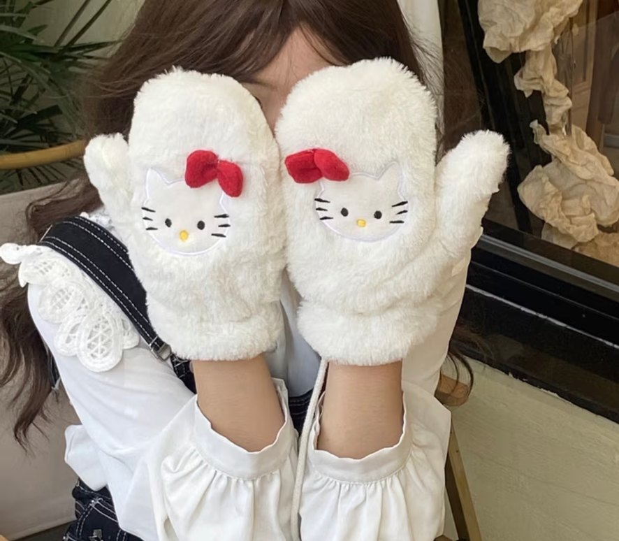 Kırmızı fiyonk detaylı, yumuşak ve sıcak beyaz peluş eldivenler. Rahat sokak stili için uygundur.