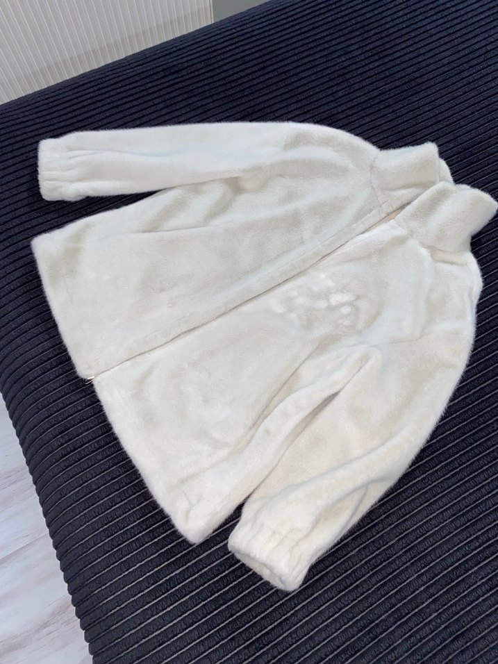 Beyaz peluş kadın ceketi, uzun kollu ve boğazlıdır. Gevşek kesimi ve normal midi boyuyla günlük kullanıma uygundur. Birkaç kez giyildi.