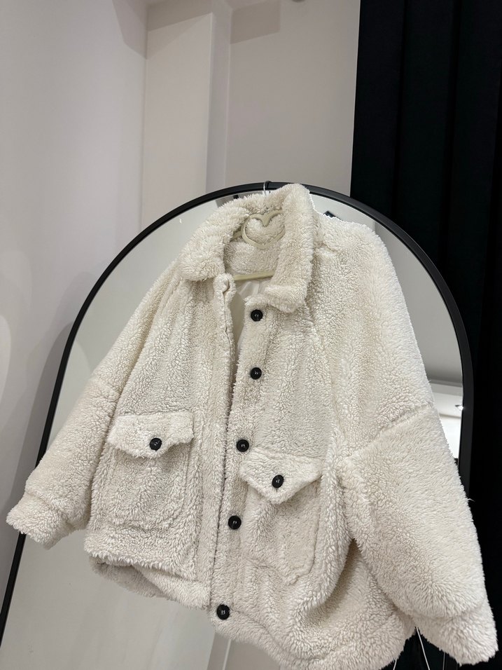 Beyaz Peluş Kadın Ceket, Geniş Kesim, Midi Boy