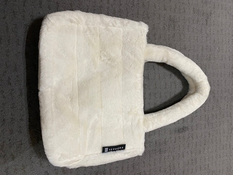 Yumuşak, peluş detaylı beyaz kadın el çantasıdır. Sade tasarımlı, günlük sokak stiline uygundur. Üzerinde SEPHORA etiketi bulunur.