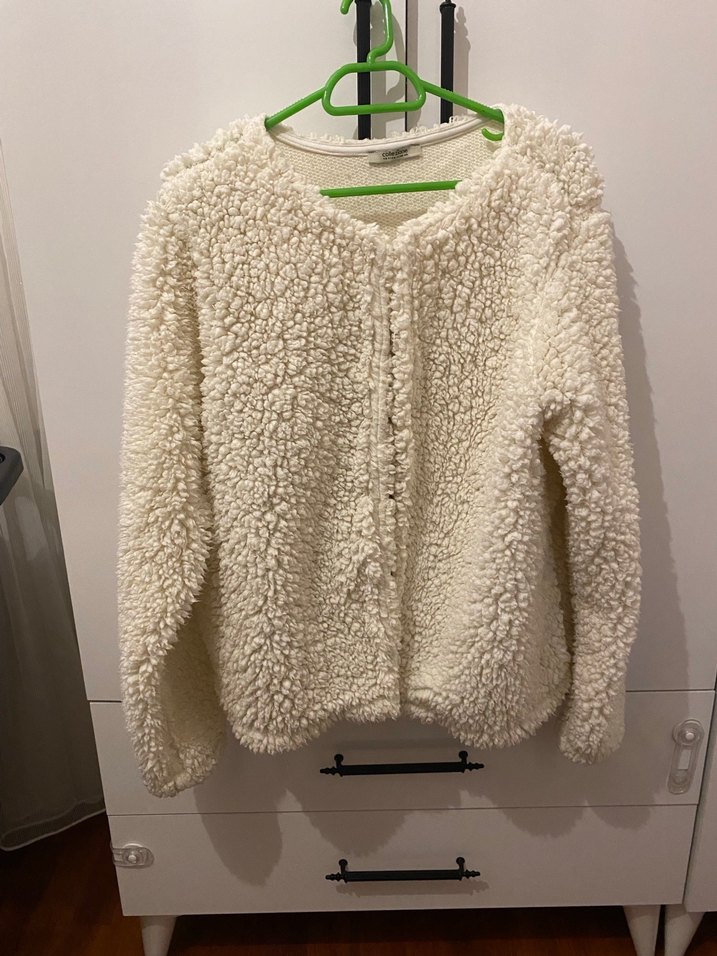 Bu beyaz örgü kadın hırka, yumuşak ve tüylü bir dokuya sahip, uzun kollu ve bol kesimdir. Yuvarlak yaka ve normal midi boyuyla günlük kullanıma uygundur.