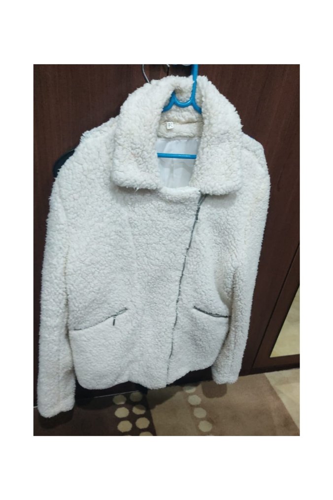 Beyaz peluş kumaştan, kürklü detaylı, notalı yaka ve bol kesimle günlük kullanıma uygun kadın kış ceketi.❄️