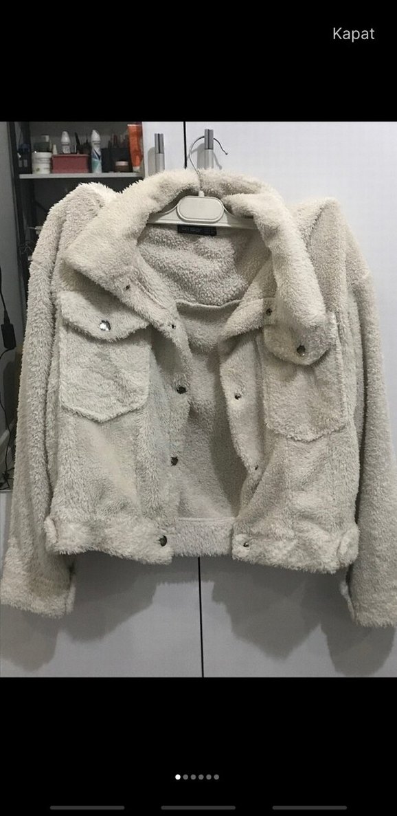 Beyaz renkli, uzun kollu mini ceket, peluş yumuşak kumaş ve kürk detaylıdır. Notlu yaka ve ön cepleri vardır, rahat ve salaş kesimdir.
