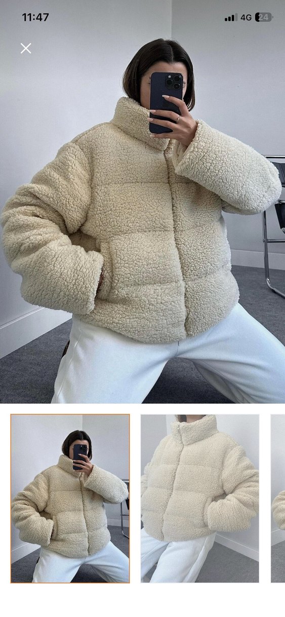 Beyaz peluş kumaştan, bol kesim ve midi boyda kadın kışlık ceket. Yuvarlak yaka ve uzun kollu, kürk detaylı dokusu ile trend bir tarz sunar. Birkaç kez kısa süreli kullanıldı