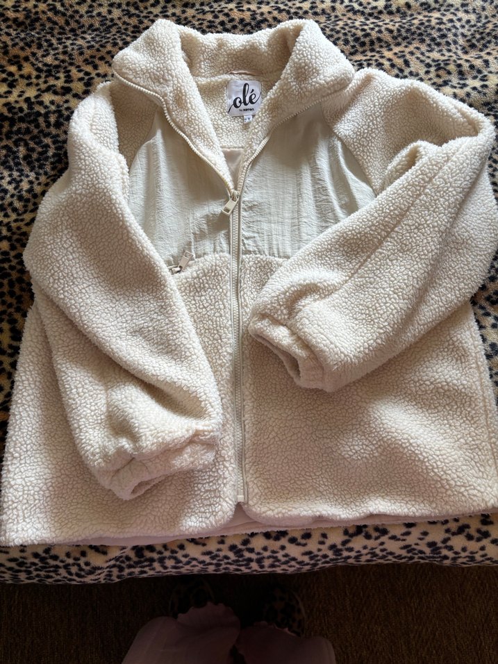 Bu beyaz midi ceket, yüksek yakalı ve uzun kolludur. Yumuşak, peluş kumaştan yapılmış, gevşek kesimli ve fermuarlı. Rahat sokak stili için uygundur.