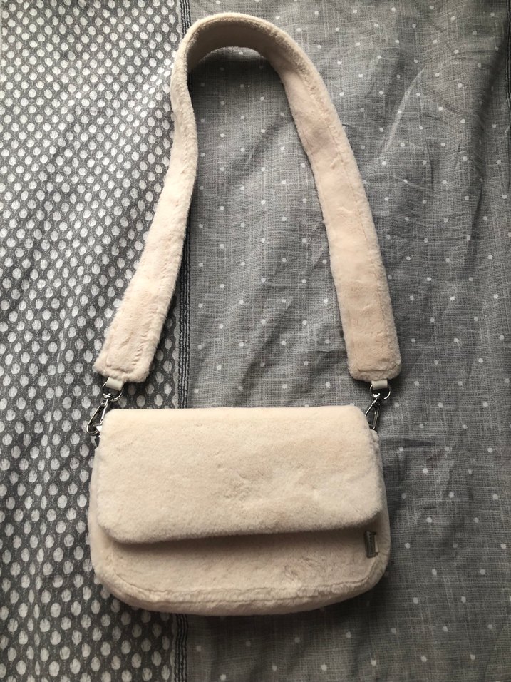 Yumuşak beyaz peluş malzemeden yapılmış, kürk detaylı, rahat ve şık kadın omuz çantası. Ayarlanabilir askısı ile kullanım kolaylığı sağlar.