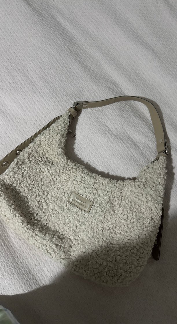 Yumuşak, kürk detaylı kumaş ve ayarlanabilir askıya sahip beyaz omuz çantası, rahat sokak stili için uygundur.