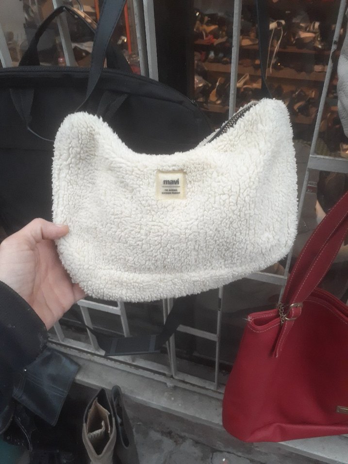 Yumuşak peluş dokusuyla beyaz omuz çantası, sade tasarımı ve rahat sokak stiliyle günlük kullanıma uygundur.