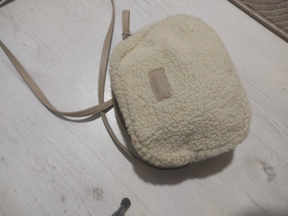 Yumuşak peluş kumaşlı, beyaz renkte, kürk detaylı kadın omuz çantası. İnce askılı, desensiz ve günlük kullanıma uygun normcore tarzda.